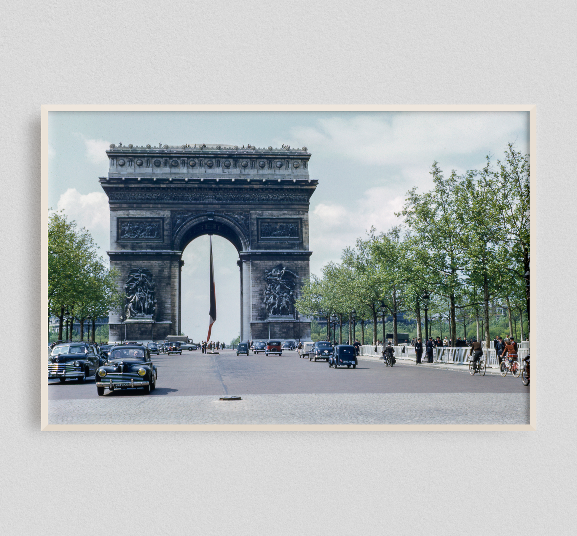 The real magic in images like this one is the way it instantly pulls us back through time, depositing each of us in a completely different era and place. Young trees with rich green leaves spreading upward to the sun, the cars a living banner of the time’s transportation as people pass by on bike and foot create a sense of what this notable place was like in decades gone by. The only thing that remains in some way familiar to our modern sense of place is the arch standing tall before us with its carefully carved design, a recognizable piece even to those who cannot call it by name.